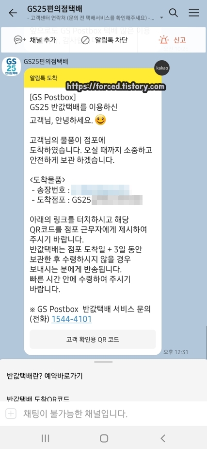 GS25 반값 택배가 점포에 도착하게 되면 이렇게 카카오톡으로 알림톡이 오는데요. 알림톡 아래에 보이는 '고객 확인용 QR 코드'를 통해 택배를 수령할 수 있습니다. 그런데 만약 상대방(택배 발송인)이 택배 수령인 번호를 잘못 입력했다면, 이러한 알림톡이 안 올 수 있습니다. 택배가 도착할 때가 되었는데도 택배 도착 알림톡이 오지 않는다면, 해당 점포를 방문해보세요.