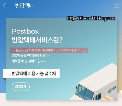 GS25 반값 택배 서비스는 국내 유일 공휴일 배송이 가능한 택배 서비스입니다. GS25 편의점 물류 인프라를 활용한 새로운 배송 서비스이기 때문에 공휴일 배송이 가능한 것이죠.