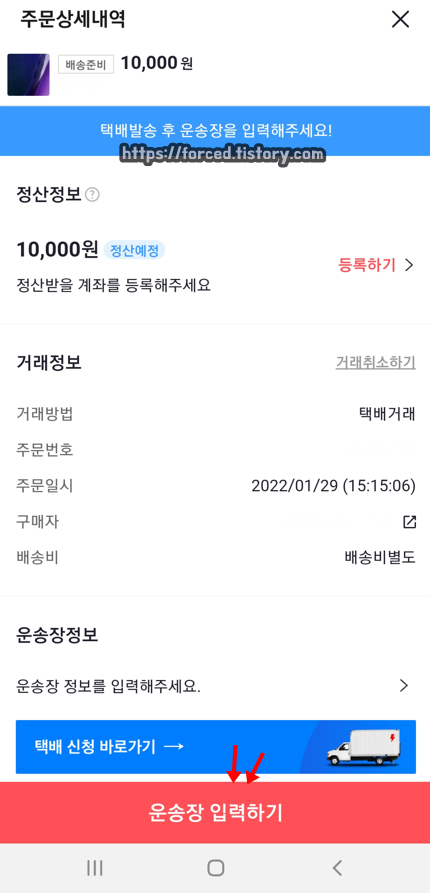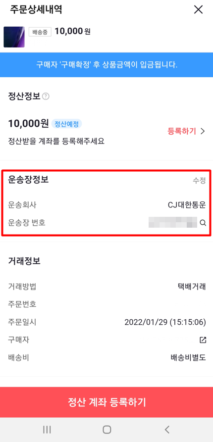 운송장 정보 입력을 완료했다면, 아래에 보이는 '정산 계좌 등록하기'를 눌러줍니다.
