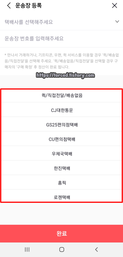 택배로 발송하는 경우라면 택배 정보를 입력해주고, 퀵이나 직접 전달의 경우에는 '퀵/직접전달/배송없음'을 선택해줍니다.