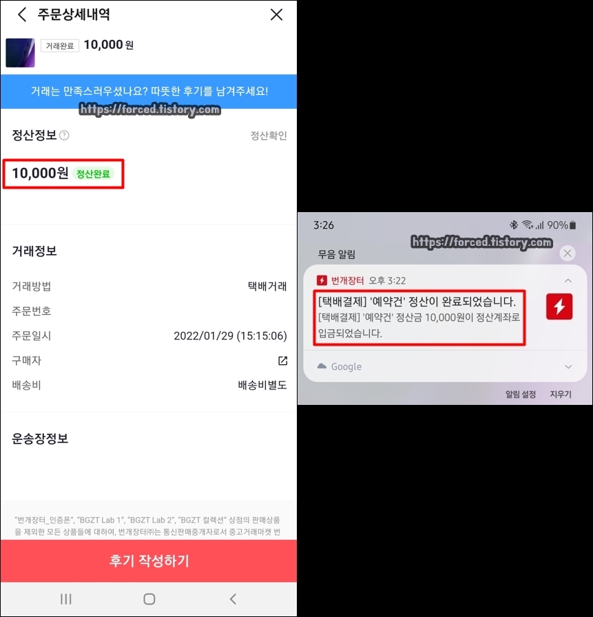 구매자의 구매 확정 및 판매 대금 정산이 완료되면, 이렇게 "[택배결제] '예약건' 정산이 완료되었습니다."라는 알림이 옵니다. 거래 종료 소식을 공식적으로 전해주는 알림이죠.