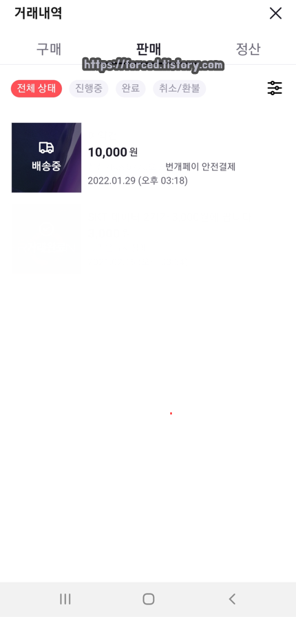 판매 탭으로 가면 이렇게 거래 상태(배송중)를 확인할 수 있습니다.