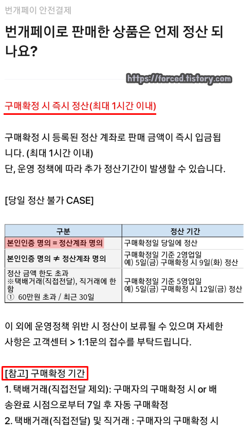 그런데 만약 번개장터 명의와 정산 계좌 명의가 다를 경우, 구매 확정일 기준 2영업일 이후에 처리됩니다. 그리고 또 정산 금액 한도를 초과한 경우라면 구매 확정일 기준 5영업일 이후에 처리됩니다.
