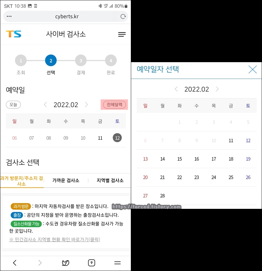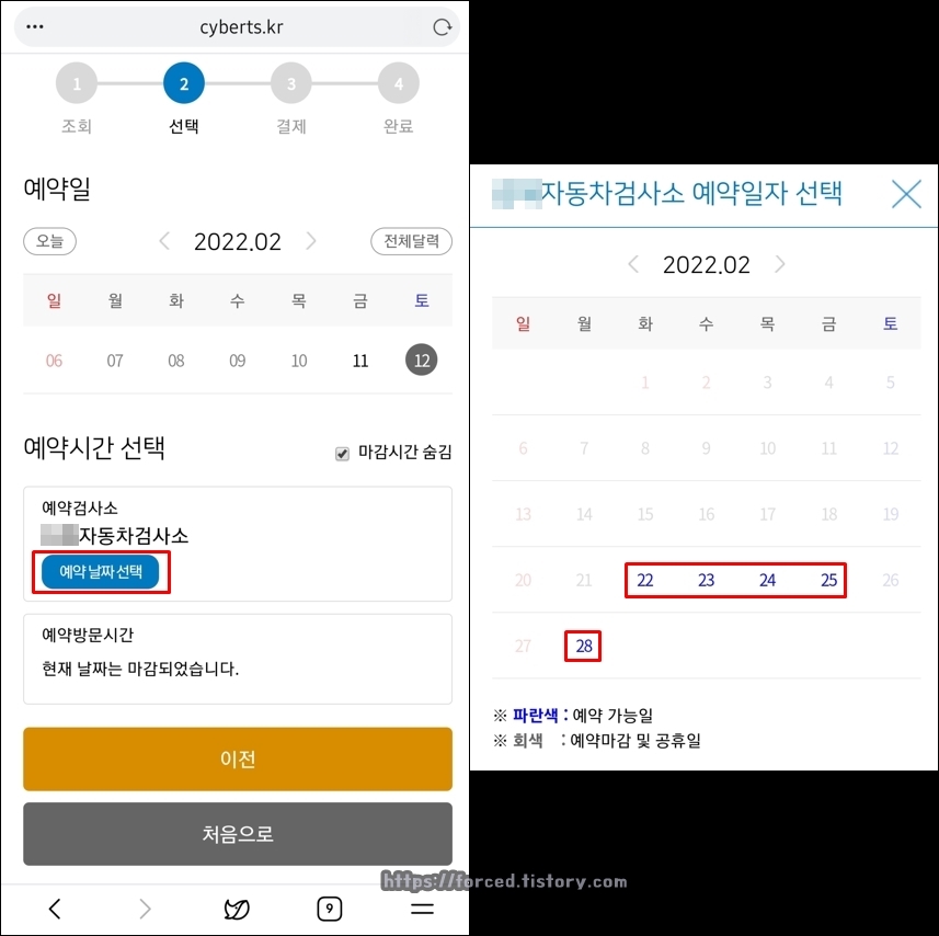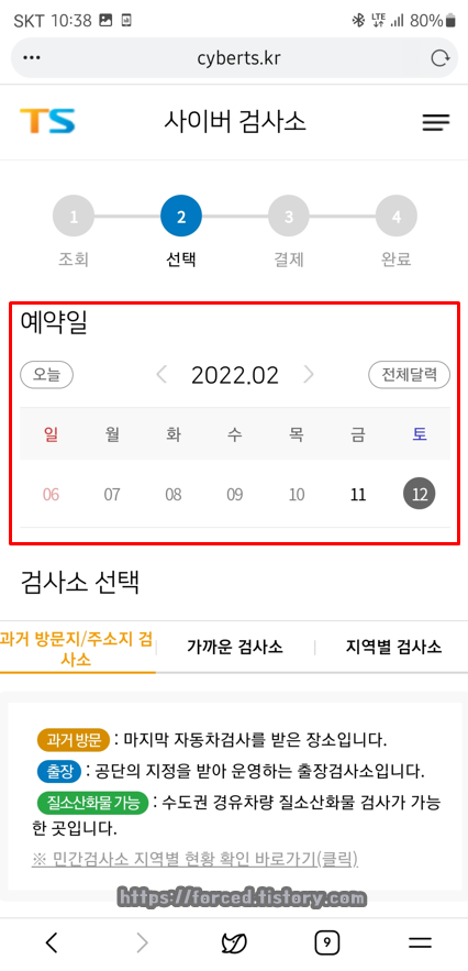 그렇다면 아래에 보이는 '예약 날짜 선택'을 통해 정기 검사 예약 신청이 가능한 날짜를 확인해줍니다.