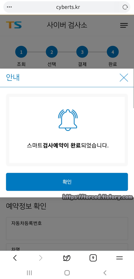 자동차 정기 검사 수수료 결제를 완료해주면, 이렇게 자동차 검사 예약이 완료됩니다.