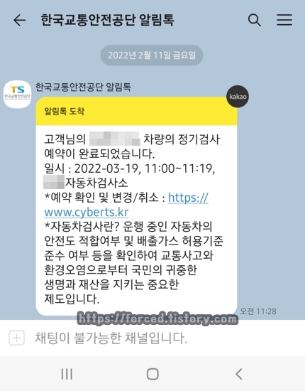 자동차 검사 예약 정보는 한국교통안전공단 알림톡으로도 확인 가능합니다.
