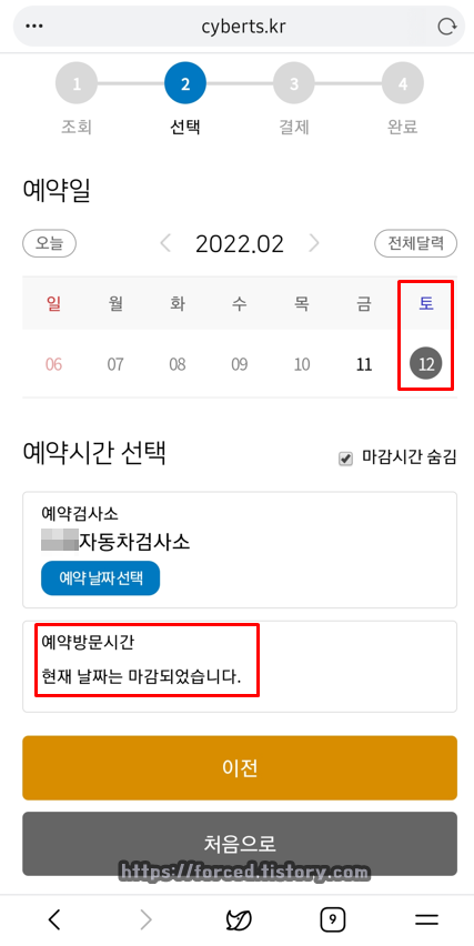 예약일과 검사소를 선택하고 보니 해당 날짜는 자동차 정기 검사 예약이 마감되어 예약할 수 없다고 나오는군요.
