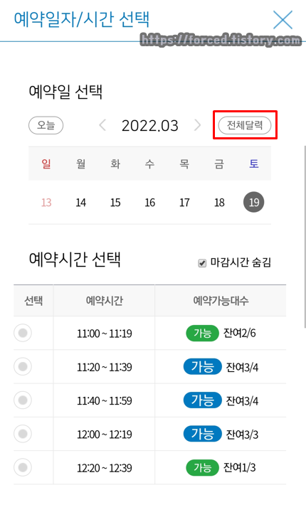 '예약 변경'을 눌렀을 때 화면입니다. 예약일자와 시간을 변경할 수 있습니다. 예약 변경 가능 일자는 예약일로부터 63일자까지입니다.