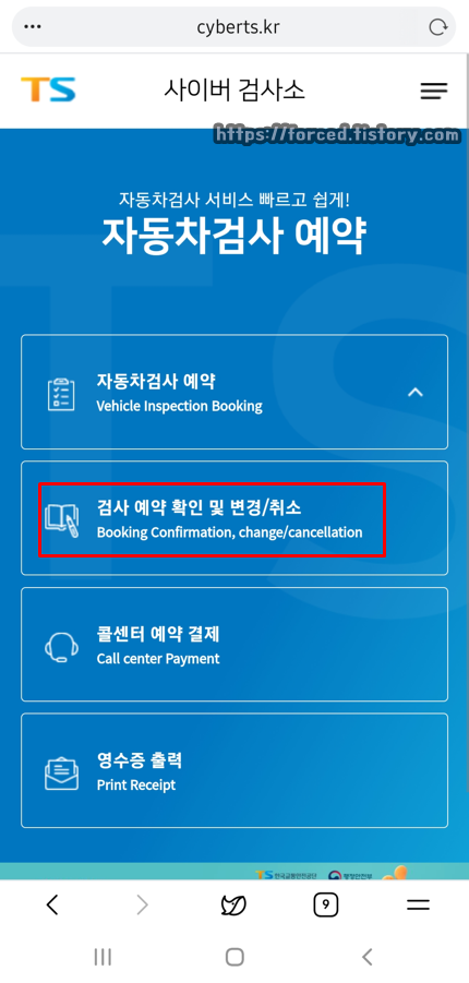 홈페이지 접속 후, '검사 예약 확인 및 변경/취소'를 눌러줍니다.