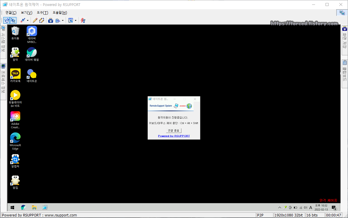 ※ 상대방이 키보드 및 마우스 제어 중단 단축키인 '컨트롤+알트+쉬프트'를 누르면 나의 키보드와 마우스는 사용할 수 없게 됩니다.