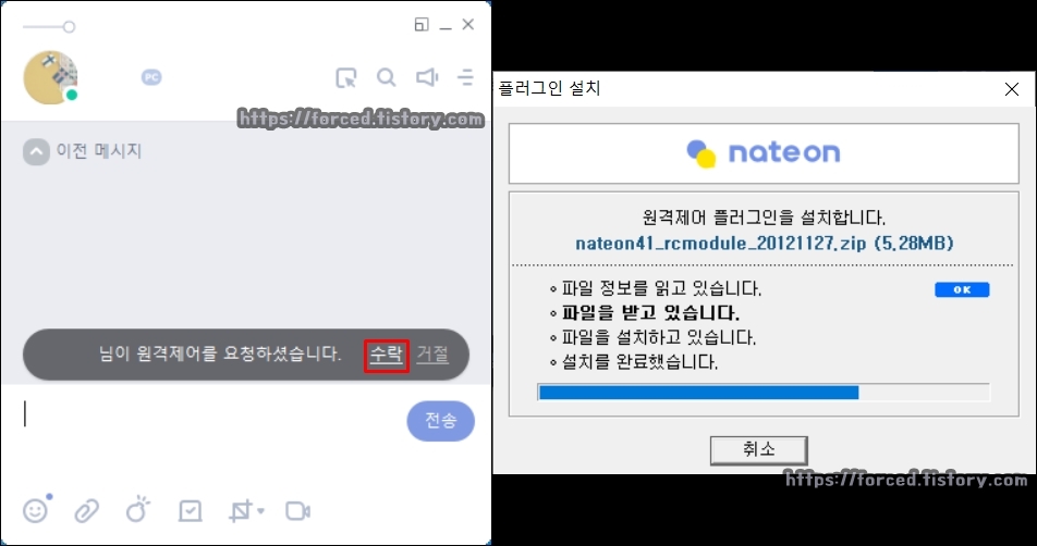 이것은 네이트온 원격제어 요청을 받은 상대방 모습입니다. 상대방이 '수락'을 누르면 원격제어 플러그인이 자동으로 설치되고, 플러그인 설치가 완료되면 원격제어가 바로 시작됩니다.