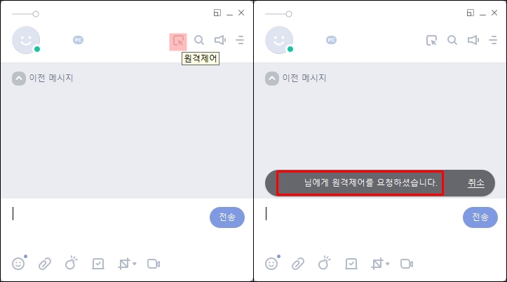 이어서 채팅방 상단에 보이는 '원격제어'를 눌러줍니다. 위와 같이 "원격제어를 요청하셨습니다."라는 문구가 뜬다면 원격제어 요청이 제대로 간 것입니다.