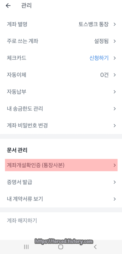 이어서 문서 관리에 있는 '계좌개설확인증 (통장사본)'을 눌러줍니다.