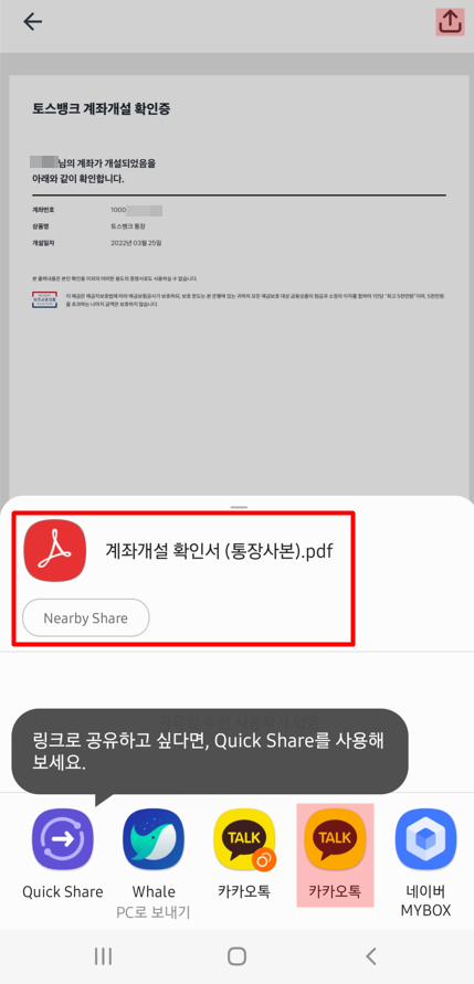 토스뱅크 계좌개설 확인증 화면에서 우측 상단에 보이는 '보내기 버튼'을 눌러줍니다. 이어서 통장 사본 보낼 곳을 선택해줍니다.