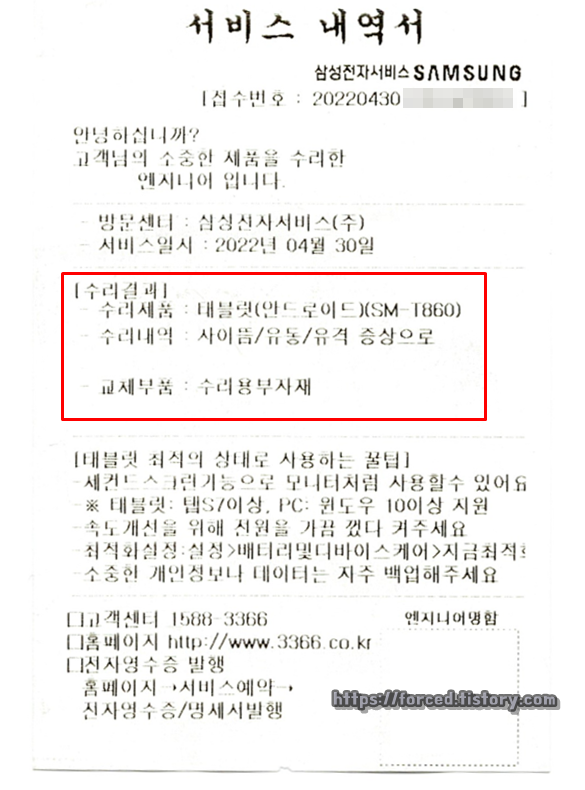 이것은 카드 영수증과 함께 주신 '서비스 내역서'입니다. 여기에는 수리 제품, 수리 내역, 교체 부품에 대한 내용이 적혀있네요.