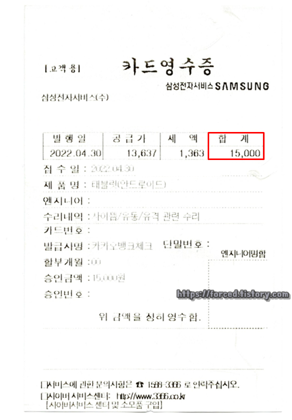 30분 정도 지났을 무렵, 기사님이 부르셔서 수리 내역 설명 듣고 기기 수령했습니다. 이후 수리 비용 결제를 진행하고, 카드 영수증과 서비스 내역서를 받았습니다. (삼성전자 서비스센터 기사님은 정말 친절하셨습니다.)