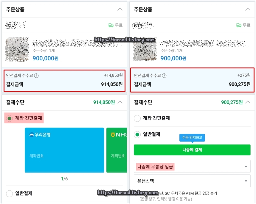 물건 가격 90만원짜리를 '계좌 간편결제'로 구매한다면 안전결제 수수료가 14,850원이지만, '나중에 무통장 입금'으로 구매하면 안전결제 수수료가 275원입니다. 수수료 차이가 굉장히 많이 난다는 것을 알 수 있습니다.
