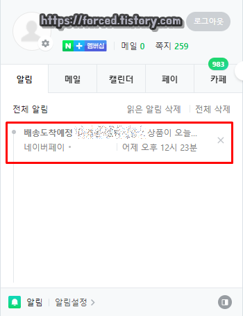 배송 시작 알림도 네이버 앱이 설치되어있다면, 이렇게 알림을 받을 수도 있습니다.