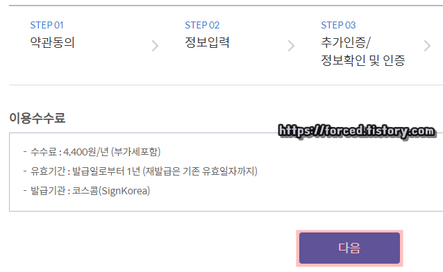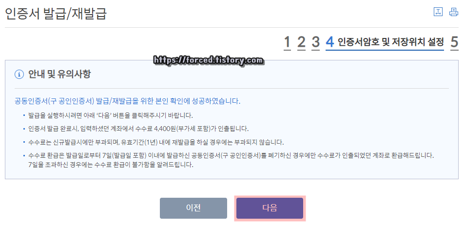 인증서 종류를 선택해줬다면, 아래에 보이는 '다음'을 눌러줍니다.