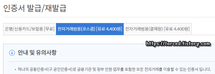 범용 공인인증서 발급 선택 창을 보면 '전자거래범용(코스콤)'과 '전자거래범용(결제원)'이 있는데요. 이 둘은 발급 기관만 다를 뿐 범용 공인인증서로서의 기능은 동일하니 참고하세요.