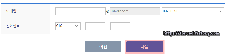 마지막으로 이메일과 전화번호를 입력한 후, '다음'을 눌러줍니다.