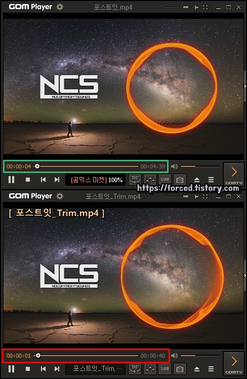 원래 원본 영상은 총 길이가 04분 39초인데요. 자르기 편집이 완료된 영상은 총 길이가 40초로 되어있죠? 즉, 제가 설정한대로 편집이 잘 됐다는 것을 알 수 있습니다.