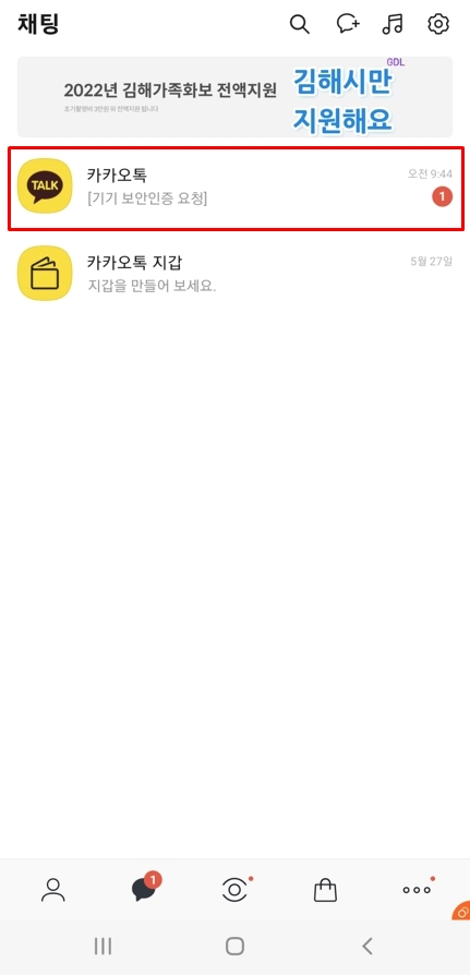 카카오톡 채팅에서 '카카오톡 [기기 보안인증 요청]' 메시지를 확인해줍니다.