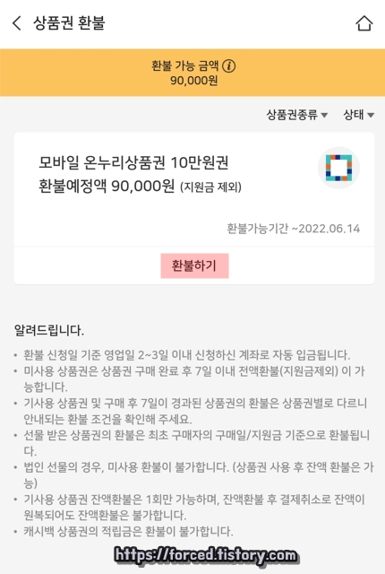 ※ 캐시백 상품권의 적립금은 환불되지 않습니다.