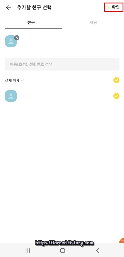 멀티프로필 보여줄 친구 설정을 완료한 후, 우측 상단에 '확인'을 눌러줍니다. 그러면 이제 해당 친구는 내 기본 프로필이 아닌 '멀티프로필'만 볼 수 있습니다.