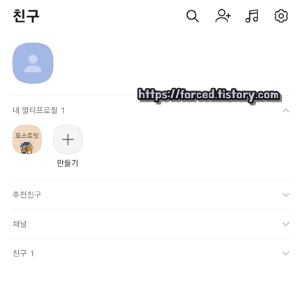 멀티프로필 설정 해제 이후, 멀티프로필 설정을 해제한 친구 입장에서 보는 모습입니다. 이제는 이렇게 무미건조한 기본 프로필만 보이고 있죠.