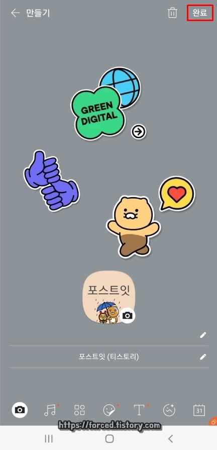 프로필 사진, 배경 사진, 이름(닉네임), 상태 메시지 설정을 완료했다면, 우측 상단에 보이는 '완료'를 눌러줍니다.