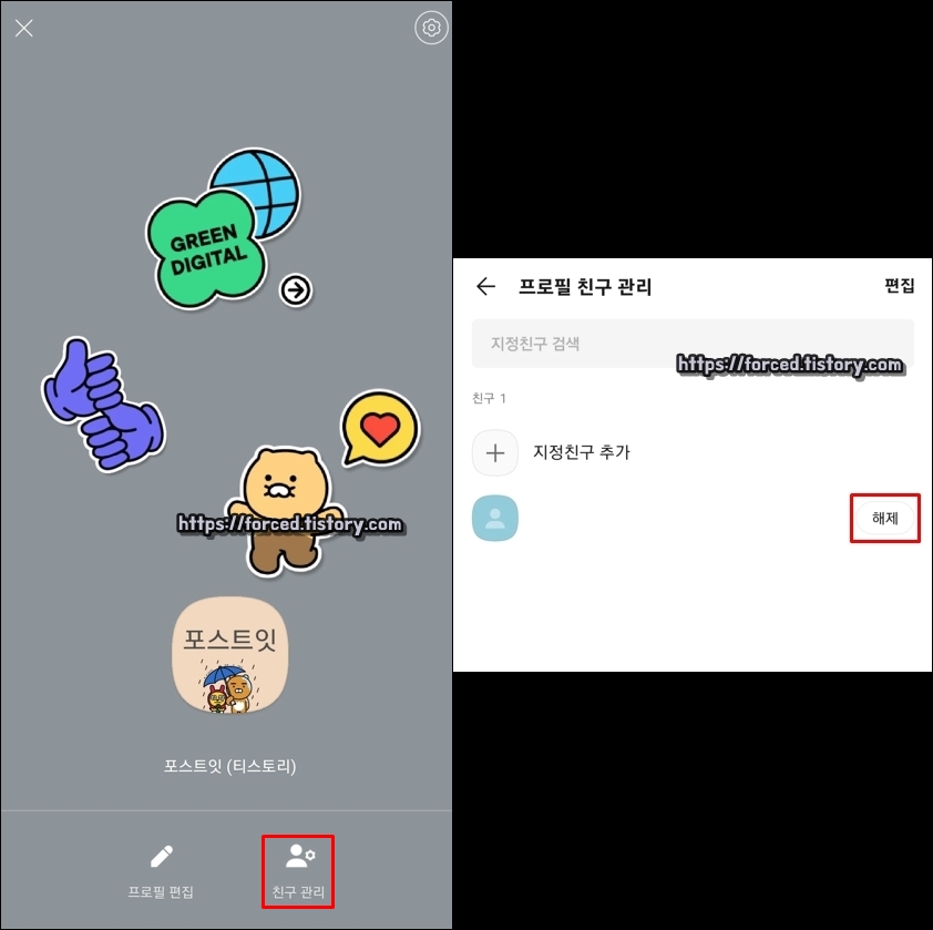 멀티프로필 설정 화면에서 '친구 관리'를 눌러줍니다. 그리고 우측에 보이는 '(멀티프로필 설정)해제'를 눌러줍니다.