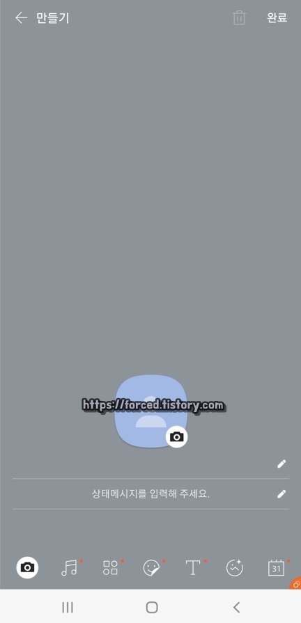 프로필 사진, 배경 사진, 이름(닉네임), 상태 메시지 설정을 완료했다면, 우측 상단에 보이는 '완료'를 눌러줍니다.