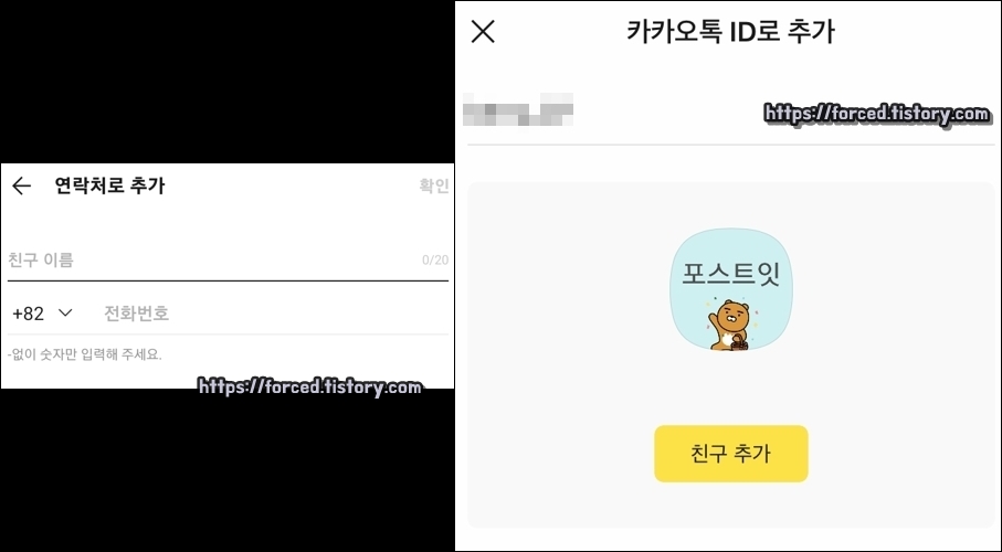 멀티프로필 테스트를 할 상대방과 일면식이 전혀 없는 지인 휴대폰으로 '전화번호' 또는 '카카오톡 ID'를 통해 친구 추가를 해줍니다.