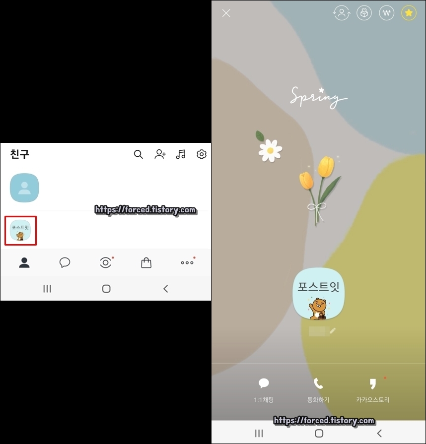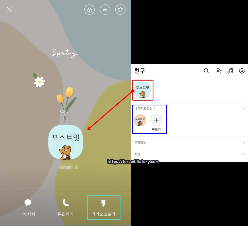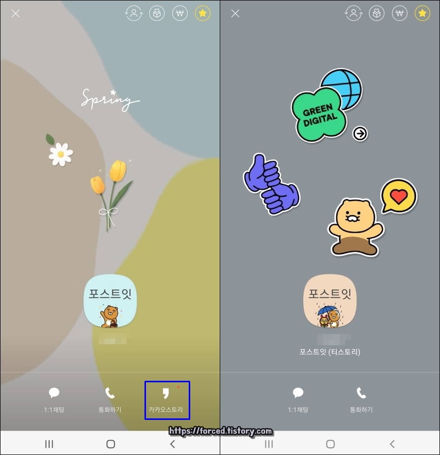 좌측은 기본 프로필이고, 우측은 멀티 프로필입니다. 멀티프로필 쪽에는 우측에 카카오스토리 아이콘이 보이지 않죠?
