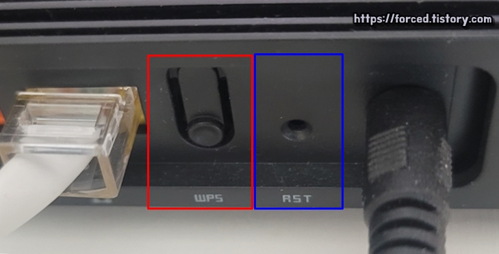 WPS 버튼과 RST 버튼은 공유기 뒤편에 각각 있습니다. RST 버튼 구멍은 조금 작기 때문에 작은 무언가로 눌러줘야 합니다.