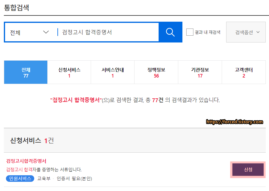 '검정고시합격증명서'가 검색 결과에 나오면 우측에 있는 신청 버튼을 눌러줍니다.