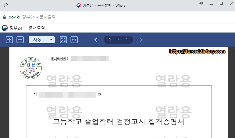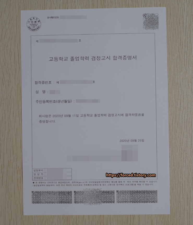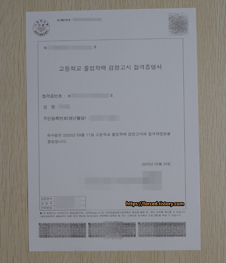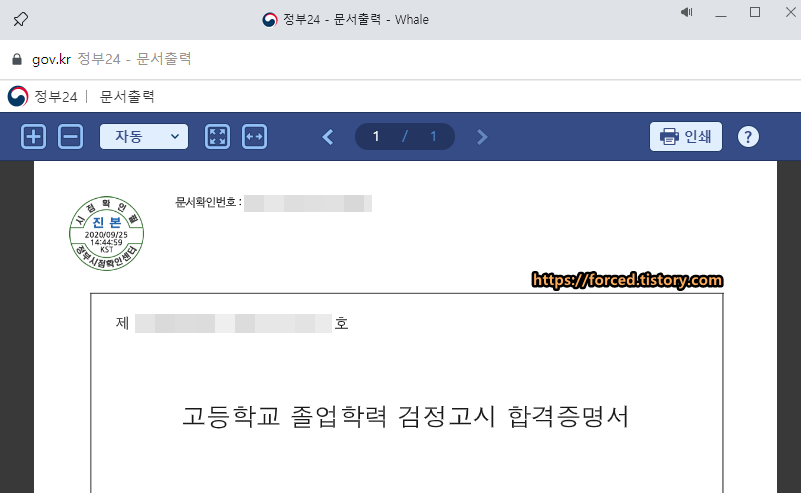검정고시 합격증명서 인쇄를 완료했습니다. 여기에는 합격증번호, 성명, 주민등록번호, 검정고시 합격일 자세히 적혀있네요.