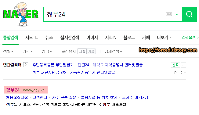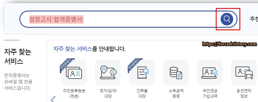 로그인 후, 메인화면 중간에 있는 검색창에서 '검정고시 합격증명서'를 입력해줍니다.