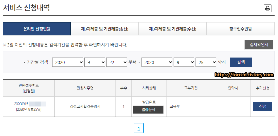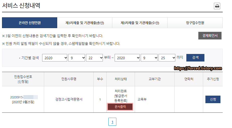 그러면 검정고시 합격증명서 발급이 완료되면서 서비스 신청내역 메뉴로 이동될 것입니다. 발급이 완료되었으니 이제 프린트를 해야겠죠? 화면에 보이는 문서출력 버튼을 눌러줍니다.