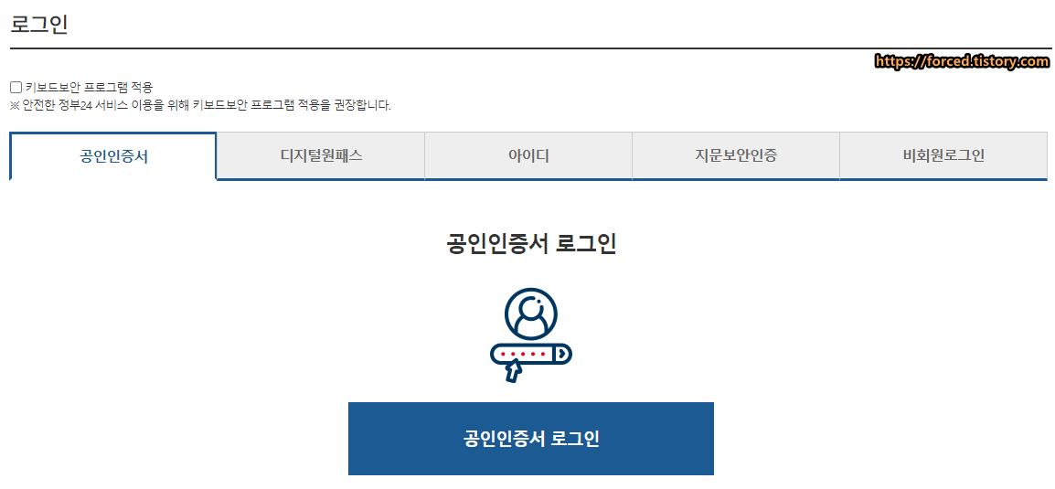 로그인은 공인인증서, 디지털원패스, 아이디, 지문 보안인증, 비회원 로그인 중 하나를 선택하면 됩니다.