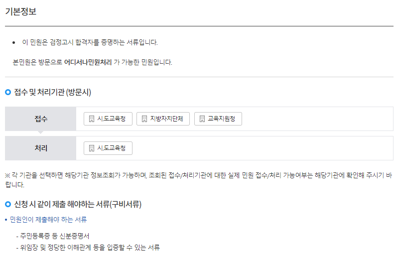 검정고시 합격증명서는 인터넷으로도 쉽게 발급받을 수 있는 서류이기 때문에. 저는 정부24 홈페이지를 통해 발급 신청하도록 하겠습니다. 만약 오프라인에서 발급받고 싶다면 본인 주소지와 상관없이 교육청, 읍. 면. 동사무소, 초. 중. 고등학교 행정실, 무인발급기에서 발급 신청하면 됩니다. 참고로 발급 수수료는 무료입니다.