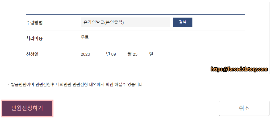 정보를 모두 입력했다면, 좌측 하단에 있는 민원신청하기 버튼을 눌러줍니다.