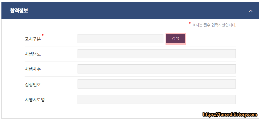 이제 합격 정보를 입력해줄 차례입니다. 고시 구분 우측에 있는 검색 버튼을 눌러줍니다.