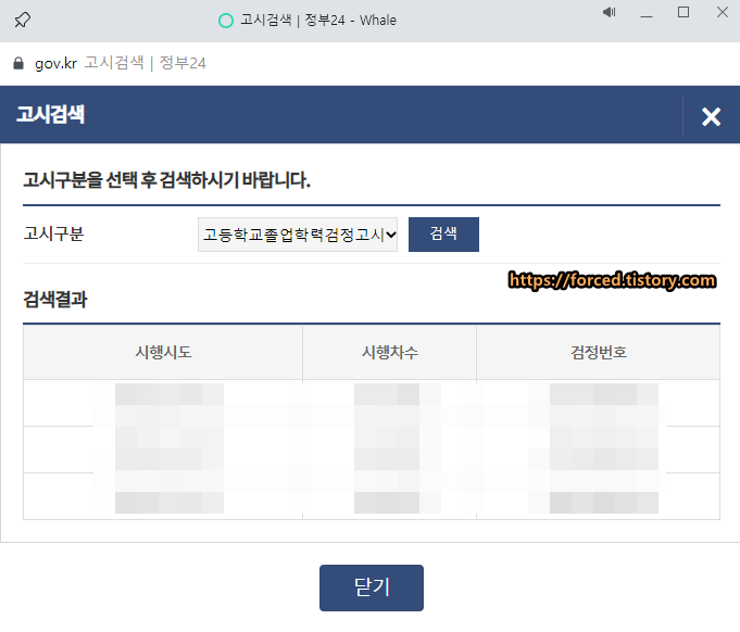 고시 구분을 선택하고, 검색 버튼을 누르면 검색 결과에 검정고시 시험에 합격한 시험 정보들이 나옵니다. 여기서 합격정보로 불러올 시험 정보를 선택해줍니다.