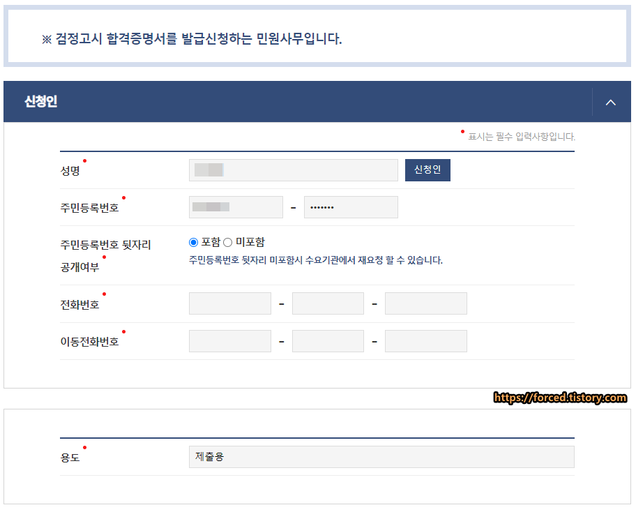 그러면 검정고시 합격증명서 신청 창이 뜨는데. 여기서 주민등록번호 뒷자리 공개 여부, 전화번호, 이동전화번호를 입력해줍니다.
