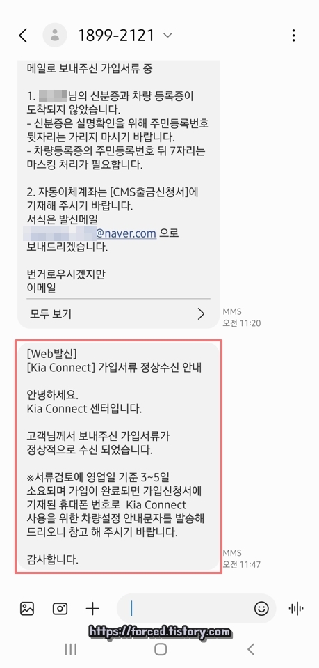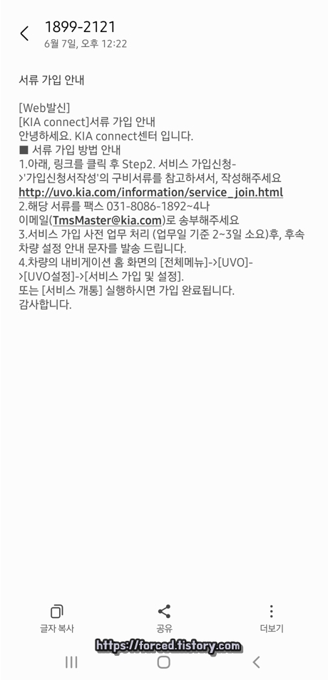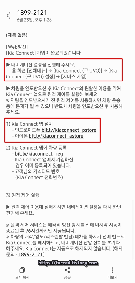 기아 커넥트 고객센터 '1899-2121'에 문의하면 이렇게 기아 커넥트 가입방법을 문자로 자세히 안내를 해줍니다.
