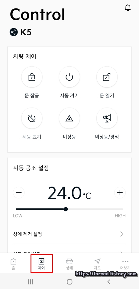 기아 커넥트 앱에서 '제어'로 가면 문 잠금, 시동 켜기, 문 열기 등 스마트폰으로 차량 상태를 손쉽게 제어할 수 있습니다. 참고로 아래에 보이는 시동 공조(공기조화) 설정은 에어컨 또는 히터 온도 설정입니다.