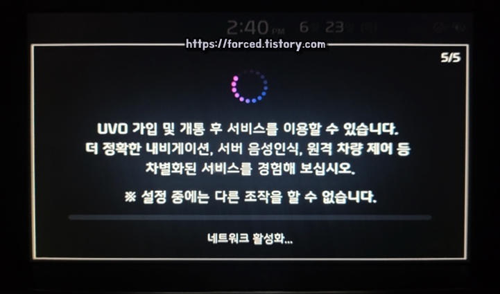 그러면 이렇게 서비스 이용 설정이 시작됩니다. 여기서 몇 분 정도 기다려주면 내비가 이전처럼 구동되면서 기아커넥트 UVO 기능을 이용할 수 있게 됩니다.