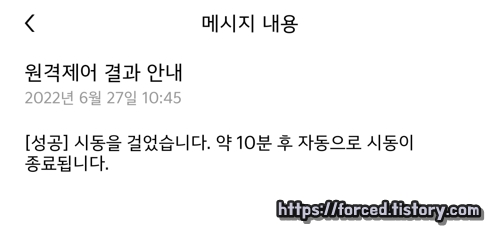 기아커넥트 차량 제어 기능이 정상적으로 구동되면 이렇게 '원격제어 결과 안내 알림'를 해줍니다. 원격 시동의 경우에는 약 10분 정도 시동 상태가 유지됩니다.